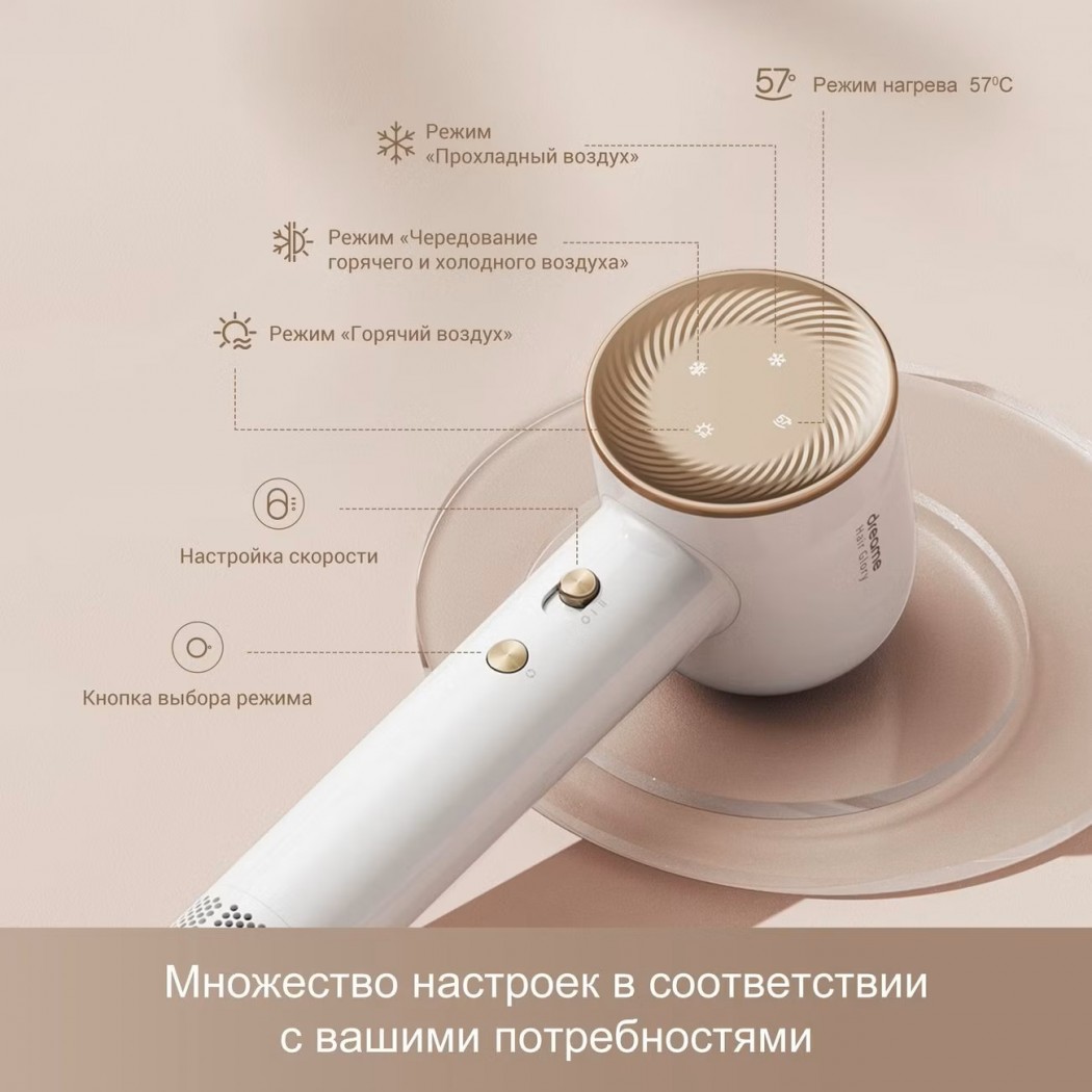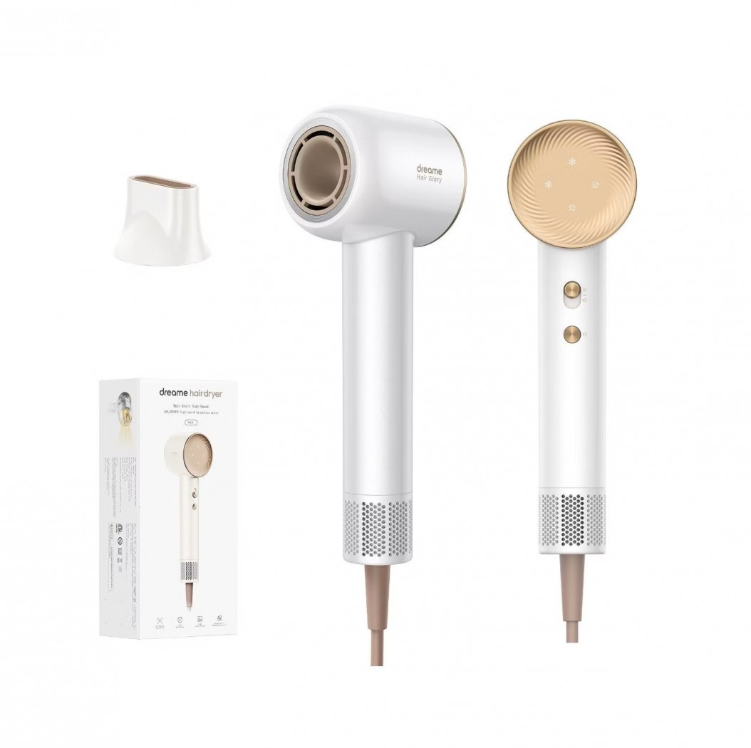Фен Dreame AHD6A-WH White с выдаваемой мощностью 1600 Вт оборудован двигателем со скоростью вращения 110000 об/мин. Особая конструкция мотора обеспечивает эффективное снижение шума, что делает эксплуатацию комфортной. Интенсивность потока до 70 м/сек позволяет высушить волосы за 3 минуты. Механические регуляторы, интегрированные в рукоятку, дают возможность установить один из двух режимов подачи воздуха и отрегулировать температуру. Доступно четыре варианта —25°C, 57°C, 85°C, попеременное воздействие теплого и горячего потоков. Прибор оборудован встроенным генератором ионов. Устройство работает от стандартной электросети с напряжением 220–240 В, для подсоединения к которой задействуется шнур длиной 1,8 м с вилкой типа «евростандарт». Модель габаритами 25,5х8,2х7,6 см и весом 345 г выполнена в высокопрочном пластиковом корпусе со съемной защитной решеткой. Изделие поставляется с магнитной насадкой-концентратором.